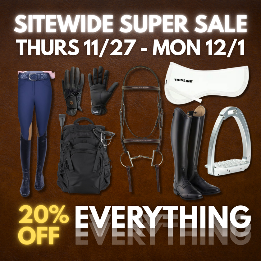 Take advantage of limited time savings SITEWIDE! Get 20% off your favorite brands like Aramas, Chestnut Bay, DeNiro, EquiFit, Kunkle Gloves, ThinLine, Tech Stirrups, & more!